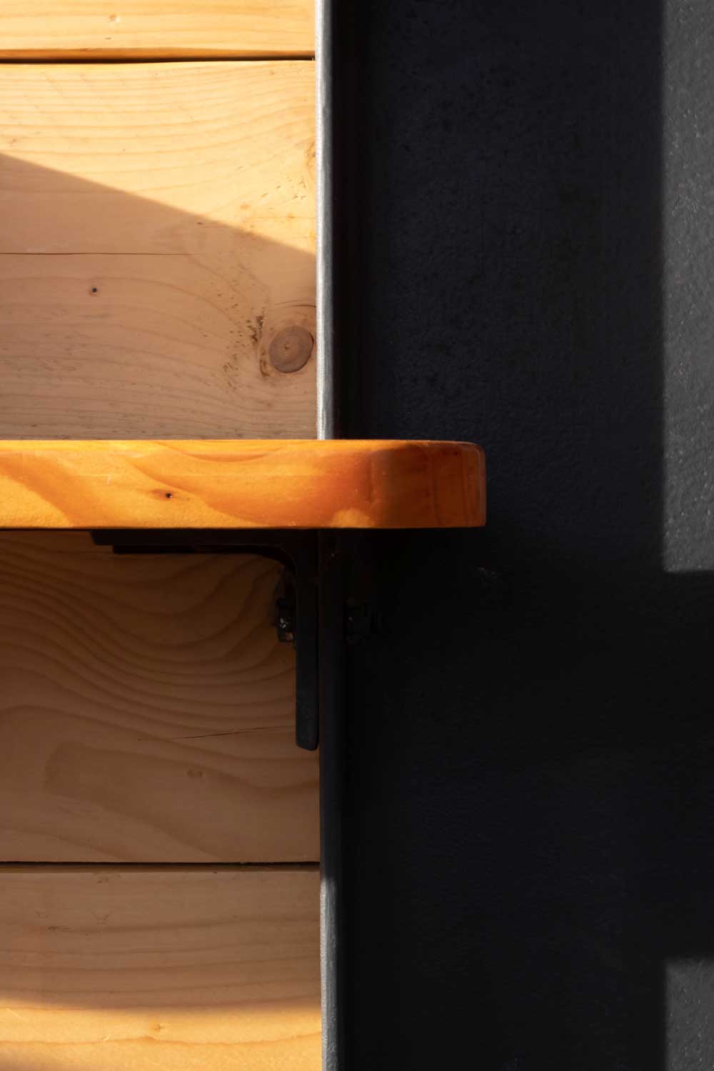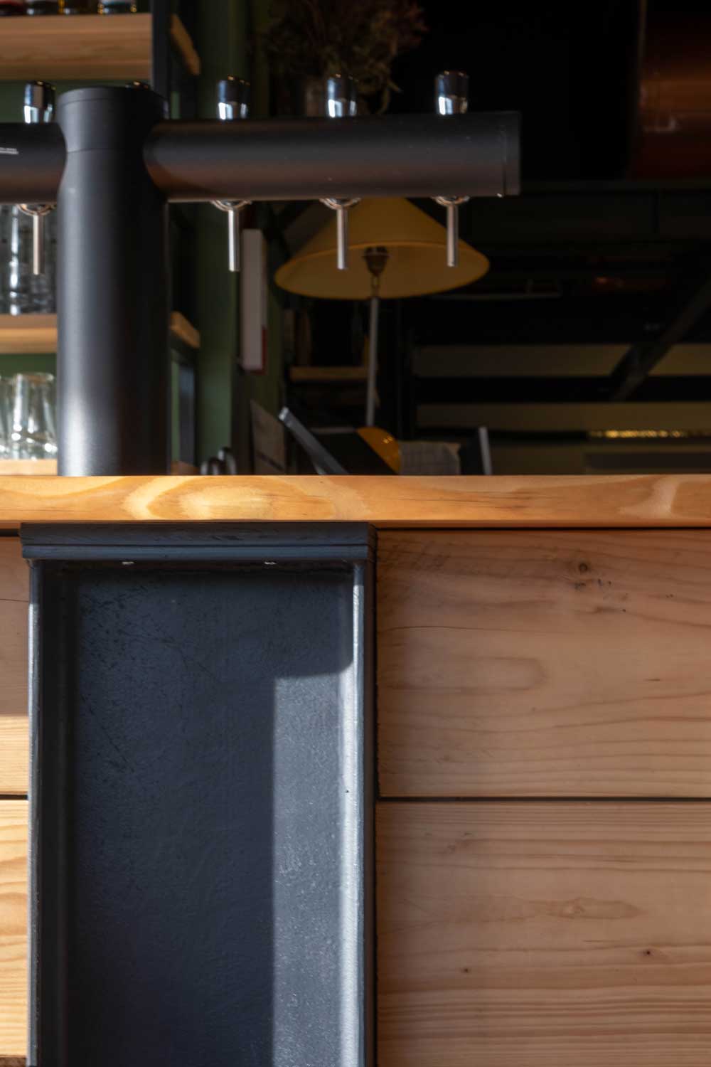 Le bar constitue l’élément central de cet aménagement et témoigne de notre engagement pour l’artisanat et la création sur mesure. Nous avons pris en charge l’intégralité de sa conception, depuis les premiers croquis jusqu’à son installation finale. La phase de fabrication en atelier a permis de concrétiser chaque détail minutieusement étudié. Dans cette réalisation presque entièrement issue du réemploi, seuls les plateaux en douglas et la visserie ont été achetés neufs, pour des raisons de sécurité et de durabilité.